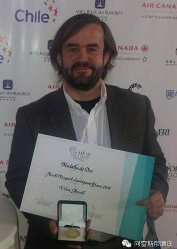 圖為阿雷斯帝首席釀酒師于2015年度智利圣地亞哥葡萄酒大賽獲金獎圖片